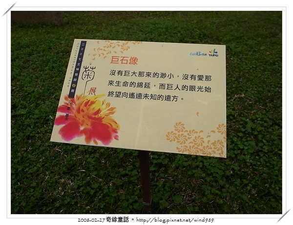 有趣的是,巨人像的解說牌不是立在附近,竟然被放在士林官邸的入口旁的草地上,但是看這片地應該是放不下如此巨大的作品,只能說是個莫名的謎。後來才知道原來菊花展時在此處是有幾具雪白的巨人像,不過現在只剩下牌子。