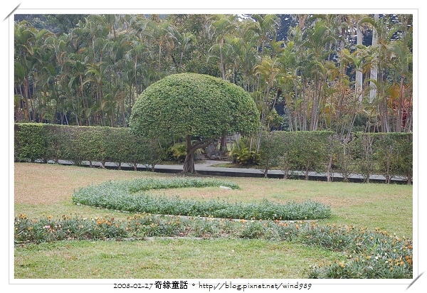 沿著花路佈出的小路,蜿蜒前進順利抵達頂著圓圓頭的樹下。記得前幾天剛經過北一女附近的重慶南路,發現所有的榕樹就像入伍的新兵,一律理成小平頭,旁邊被修得方方正正,看起來挺不協調,與士林官邸精心照料的植物處境差很多。