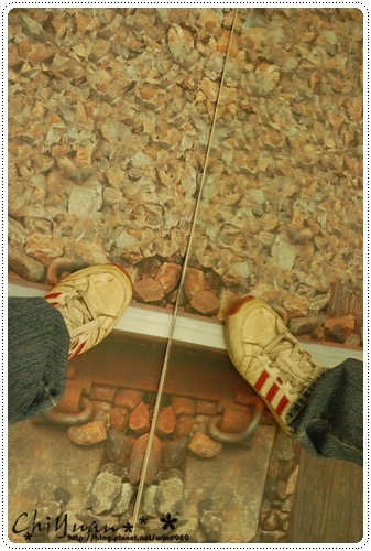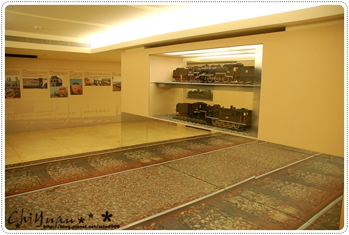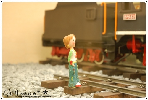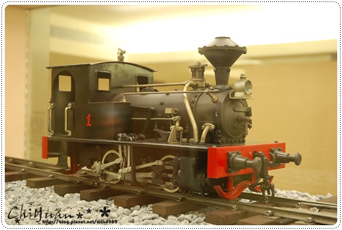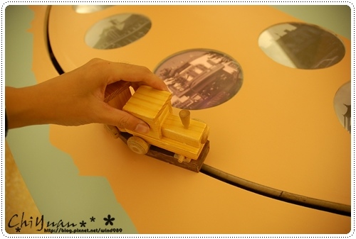 除了可遠觀不可褻玩焉的火車模型,在一旁有個木造的玩具火車,可就親近多了,明明正是小孩子玩具箱中不可缺少的一份子。(原本奇緣想推動一下,但發現好像動不了,也不太敢在博物館內大動手腳,所以就輕輕的擺個pose。)