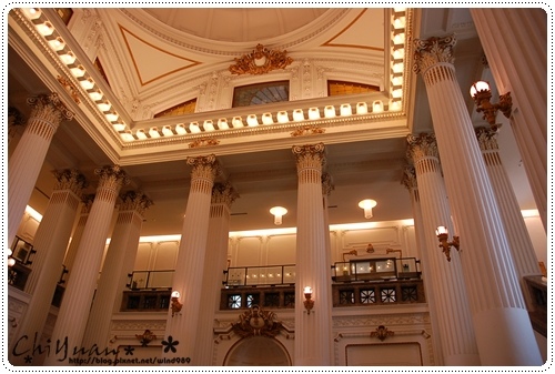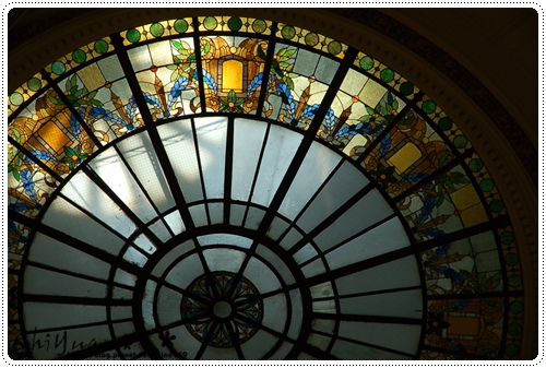 站在大廳中央,抬頭仰望,在建築物外觀的圓頂下,竟是一片彩繪玻璃天窗。日光正巧穿透彩繪玻璃,向大廳地面投射出炫麗奪目的光彩,並與一旁的燈飾互相輝映。