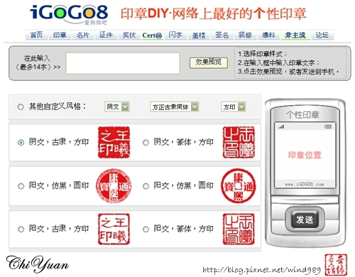 對岸大陸的愛狗狗吧網頁,在輸入處鍵入簡體中文(最多十四個字),點選下方的樣式,於一旁的手機螢幕中會出現嶄新的朱紅大印。