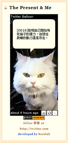 這幾天,奇緣把部落格邊欄做些小調整,把不需要的功能撤除、閱讀的順序掉換、更換與部落格風格相符的工具列,想留下清爽的版面,但在簡化的過程中,仍有增加的欄位,即是由最耀眼的叮叮頭像所製作的Twitter Balloon。