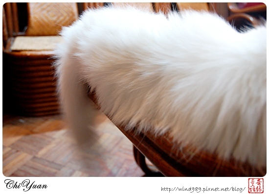不只半身的白毛幾乎是凌空,尾巴更垂在桌面下搖來晃去,完全不顧其他人投射出危險的視線,真不知道她要怎麼翻身?