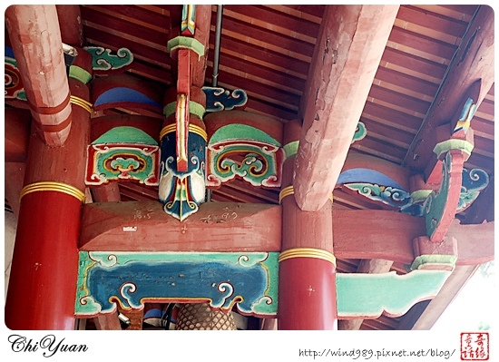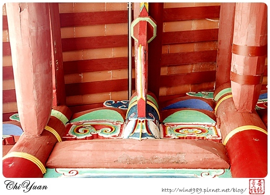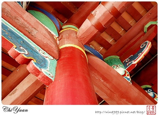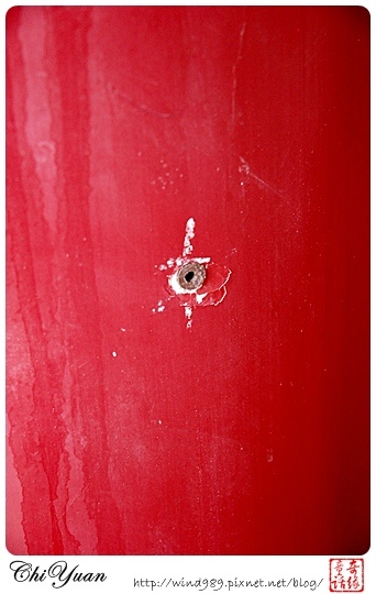 如果有黃色圓環是原本的木造柱子,而如果全身紅柱的話,則是無法修復後,所替代的水泥柱。