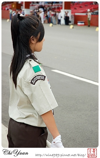 雖然當時天氣涼爽,但一直這樣站下去也是很大的負荷。而且在如此整齊的隊伍中,有一點小動作很容易就被抓出來,例如照片中就有人不小心頭歪了一下。