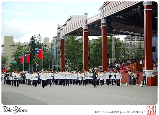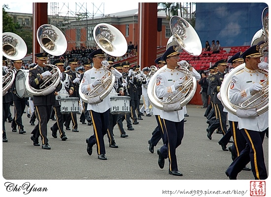 剛好奇緣回到預演現場,三軍儀隊的表演正要開始,只見國軍示範樂隊從另一頭進場。
