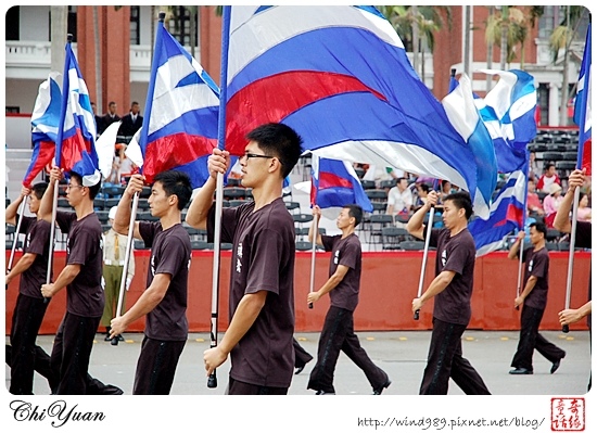帶著武術氣息的旗隊,領著國防部的花車走過。