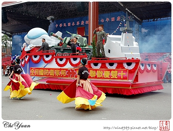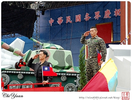 代表台灣三個軍種象徵的模型花車,其實最吸引人的是上面的精神抖擻的軍人(是真人),展現剽悍的一面。