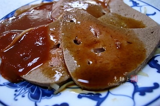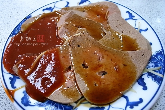 帶點粉嫩的豬肝,吃起來也偏柔嫩,口感不錯,沒有什麼腥味。一邊沾的是特製甜醬,是「乾意麵」會拌的佐醬;一邊是清淡的醬油,可能自己光吃沾醬油的這邊,對甜醬沒有太深的印象。