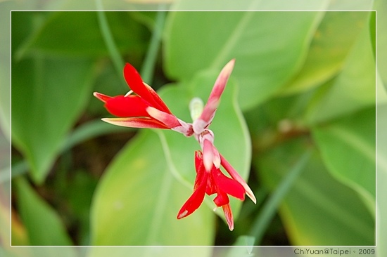 在荷花池畔一隅,一整片有像「芭蕉」的長橢圓形葉,綠葉叢燦爛耀眼的鮮紅花朵,展像古代美人之姿,有個唯美又貼切名字,「美人蕉」。