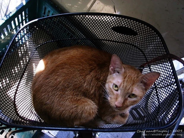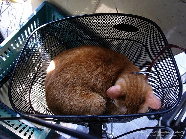 平常會看到小橘貓安穩地睡在機車坐墊上,像萬年不改的雕像,不為所動。這一天,經過騎樓下,慣性的向機車坐墊上望去,「咦~不在!」順著貓繩網下看,腳踏車小小的車籃裡位置剛好,睡一隻貓恰恰好。