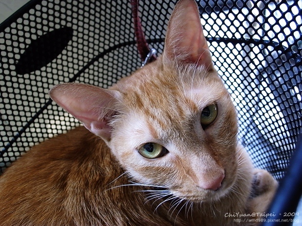 越來越貼近的奇緣,被機警的小橘貓用他銳利的眼神,掃射外加警戒一翻,這車籃可是他的睡窩,禁止閒人打擾。