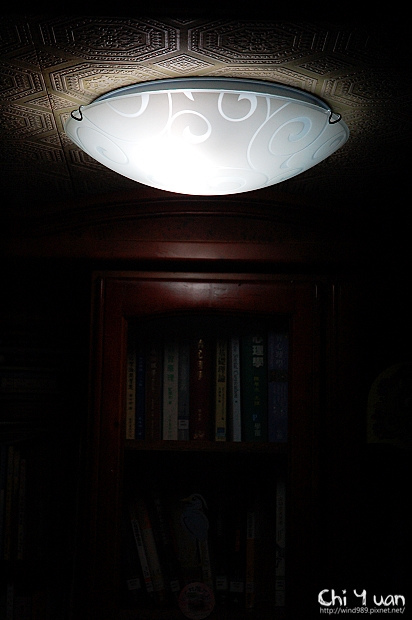 因位於大門與書櫃門開闔處,不適合垂吊的燈具,選擇空間小的吸頂燈。