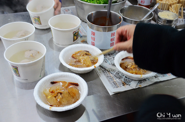 沒有多餘的人手,所以一切自助,已經放入碗肉圓、貢丸湯,說好數量,付好錢,自己加調味醬的多寡,再端到開動的位置上。