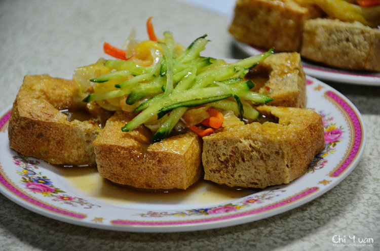 雖然是沒有泡菜的臭豆腐,中間挖了一個放進醬汁,奇緣喜歡這種作法,微鹹而入味的醬,保留在豆腐間的小洞中。