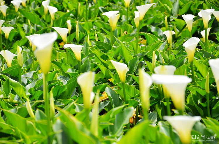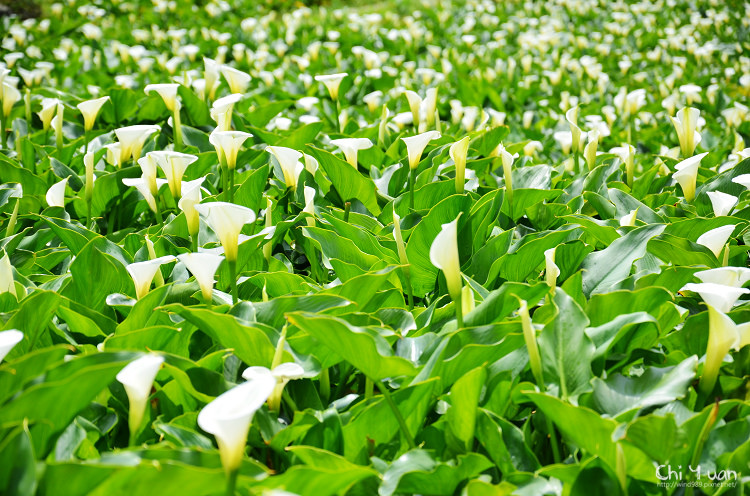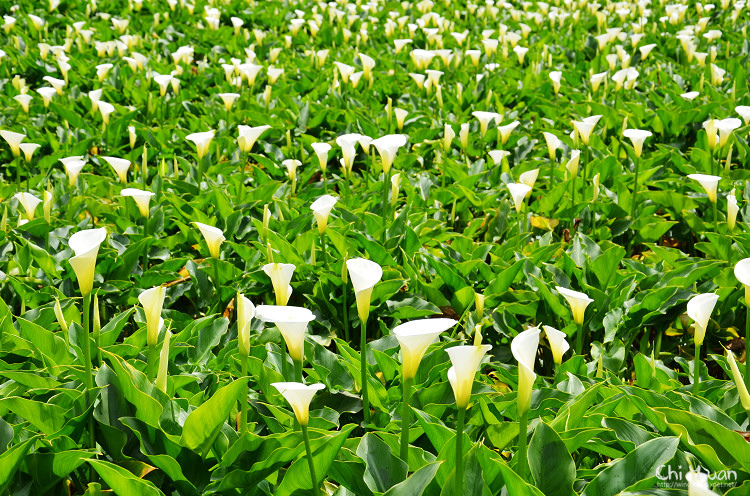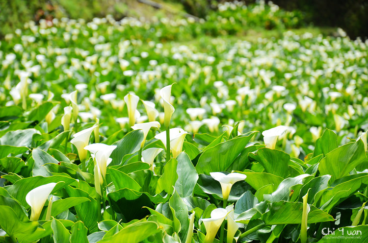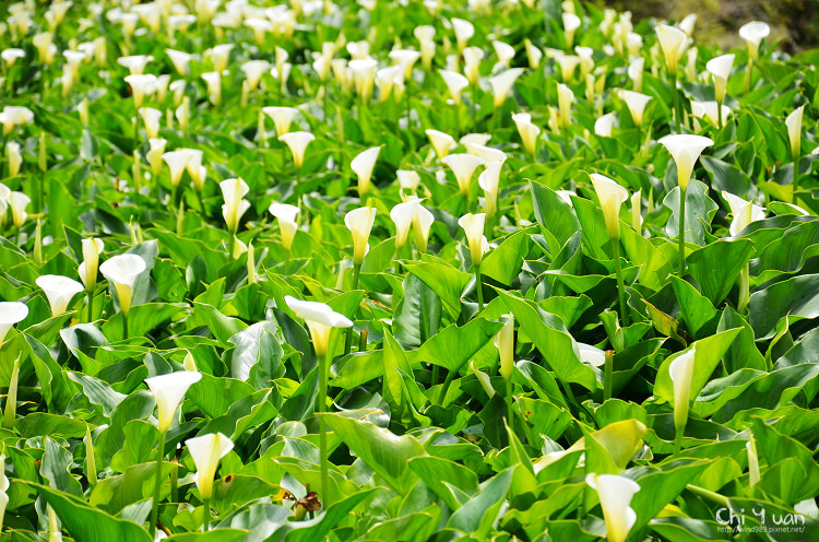 清新脫俗的海芋,恬靜地在翠綠山林的擁抱下綻放。一朵朵純淨的海芋如點點繁星,閃爍在連織的綠色海洋。