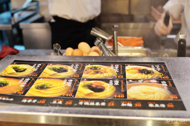 拿取托盤後,直接來點烏龍麵。共有八種選擇,以烏龍麵為基本搭配,有柴魚上湯、辛味上湯、蒜香牛肉、明太子、咖哩拌麵、湯咖哩、泡菜、沾麵等,並可加有機溫泉蛋、豆皮……等。